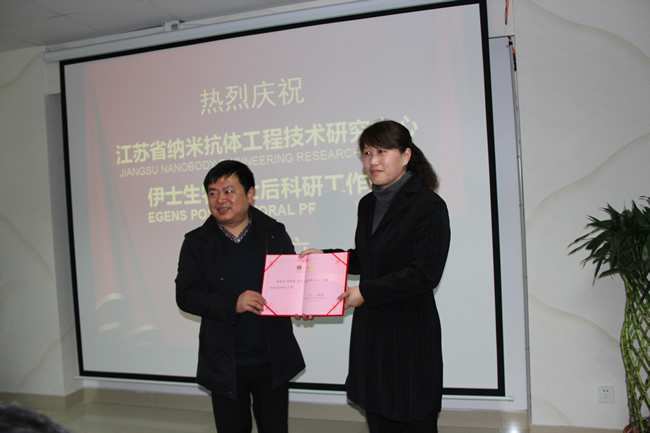 2014年3月20日,南通市伊士生物技術(shù)有限責任公司在伊士生物研究院會議室舉行了“江蘇省納米抗體工程技術(shù)研究中心、伊士生物博士后研究工作站揭牌儀式”。南通市科技局條件處 劉宏斌副處長,開發(fā)區(qū)經(jīng)貿(mào)局周愛群副局長,科技處程李榮處長,東南大學生命科學研究萬亞坤教授,南通大學吳啟運教授,河南科技學院李桂榮副教授出席了這次揭牌儀式。 會議伊始,伊士生物公司董事長歐衛(wèi)軍先生向到場嘉賓分別介紹了伊士生物公司、納米抗體技術(shù)和研發(fā)中心,隨后分別向萬亞坤教授、吳啟運教授、李桂榮副教授頒發(fā)了聘書。