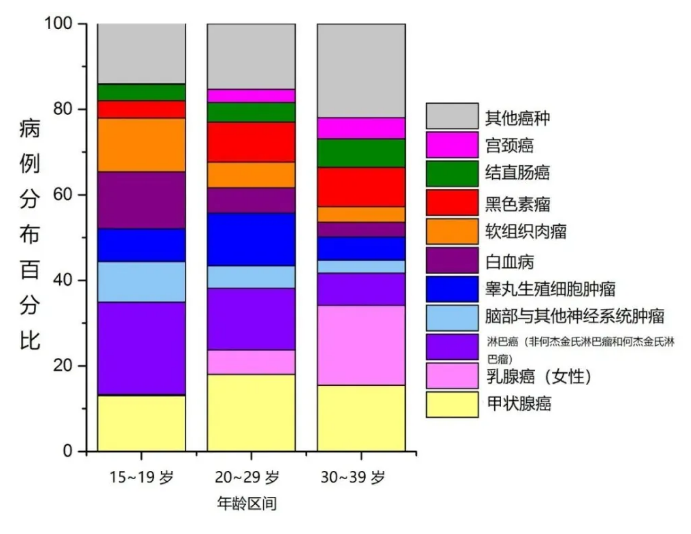 2012 年至 2016 年青少年和青壯年主要癌癥類型的病例分布(%),圖片來(lái)源:參考文獻(xiàn)[5]