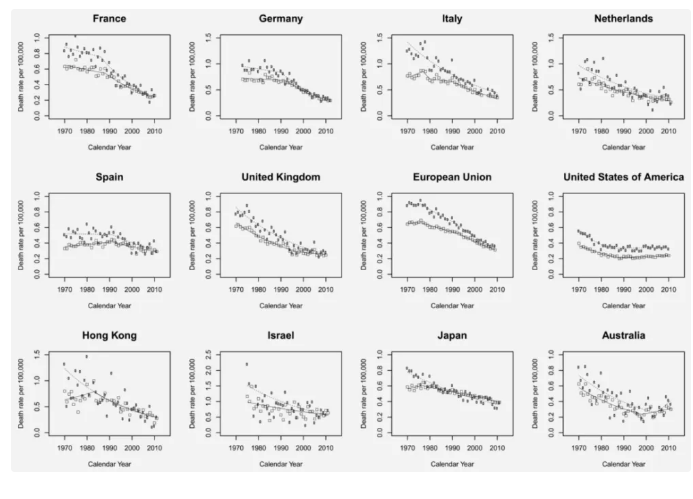1970 年至 2012 年,在不同國(guó)家和地區(qū),女性甲狀腺癌死亡率穩(wěn)定下降,圖片來(lái)源:參考文獻(xiàn)[4]