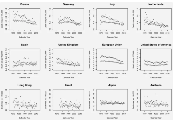 1970 年至 2012 年,在不同國(guó)家和地區(qū),男性甲狀腺癌死亡率穩(wěn)定下降,圖片來(lái)源:參考文獻(xiàn)[4]