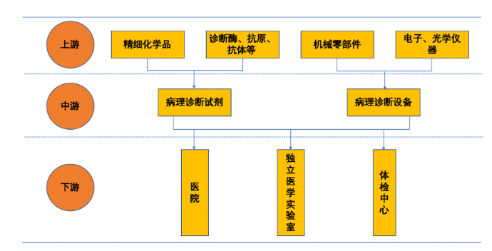 病理行業(yè)產(chǎn)業(yè)鏈包括上游原料市場、中游試劑設(shè)備市場和下游需求診斷市場。原料包括生物與化學原材料以及各種機械零配件,分子病理還會涉及到引物、探針等;中游包括病理診斷試劑和病理診斷儀器;下游需求主要來自于醫(yī)院、第三方獨立醫(yī)學實驗室、體檢中心、政府等。