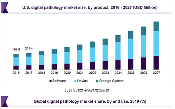 據(jù)2020年世界病理學大會報告,預(yù)計到2024年,病理學市場規(guī)模將從2019年的303億美元達到444億美元,從2019年到2024年的復(fù)合年增長率為6.1%。據(jù)GrandViewResearch預(yù)測,2019年全球數(shù)字病理學市場規(guī)模為7.676億美元,預(yù)計到2027復(fù)合年增長率為11.8%。根據(jù)最終用途,醫(yī)院在2019年占據(jù)了領(lǐng)先的市場份額。醫(yī)院采用數(shù)字掃描技術(shù)以加快診斷速度并提高患者依從性。就收入而言,2019年北美市場份額最大。