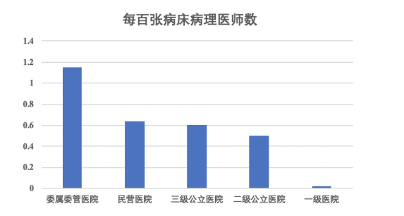 如上圖所示,其中委屬委管醫(yī)院每百張病床病理醫(yī)師數(shù)僅為1.15,三級公立醫(yī)院、二級公立醫(yī)院和民營醫(yī)院分別為0.60、0.50及0.64。根據(jù)最新發(fā)布的《2019年全國病理質(zhì)量報告》顯示,在不同級別的醫(yī)院中,全國平均每百張病床病理醫(yī)師數(shù)量為0.55,病理醫(yī)師數(shù)量奇缺的狀況沒有改善,各省、自治區(qū)、直轄市均未達到2009年《病理科建設(shè)與管理指南(試行)》(以下簡稱《指南》)的最低要求(每百張床1-2名病理醫(yī)師)。
