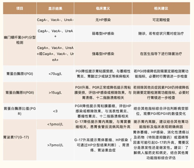 胃蛋白酶原I(PGI)、胃蛋白酶原II(PGII)、胃蛋白酶原比值(PGR)、胃泌素17(G-17)、細胞毒素(CagA)、空泡毒素(VacA)、尿素酶(Ure)